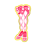 Dark pink pumps with a white heel to match the piece of material crossing the top of the foot. At the back of each heel is a small gold clip with a long, dark pink ribbon attached to it that ties around the leg, into a bow on top.