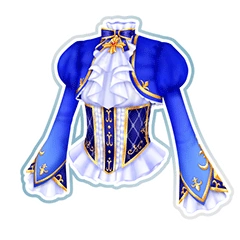 A white blouse with a dark blue and white check pattern corset. This is lined in gold with accents and pattern going down the middle. A blue cropped jacket is worn over this with gold ornate lining and designs. The ruffled white cuff has a split dark blue and gold layer over it. On the neck is a ruffled cravat with a dark blue and gold ribbon that has a gold ornament hanging from it, adorned by a ruby.