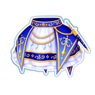 A ruffled white two-layer skirt with a patterned hem stripe matching the corset. The four-split blue peplum has gold lining and designs, each with a tiny aquamarine at the middle. Layered beneath the flaps are two gold chains, the bottom of which has four diamonds, and around the left hip is a dagger or short sword in a dark blue and gold sheath. It is accent with aquamarines. The waistband is blue and gold with a ruby diamond at the center.