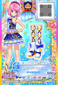 Dark blue shoes resembling the skirt, the toe is pearl blue with white frills and the sole is gold. The ruffled white cuff has an area of light blue, with a blue bow at the corner. A gold star hangs from it. Gold and dark blue ribbon wraps around each leg.