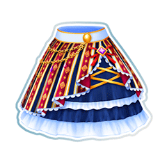 A dark blue skirt with a frilly white trim around the hem and bottom. Over the skirt is a tapered peplum made from the tops fabric, lined by white frills. At the corner is a red ribbon adorned by a purple diamond gem on gold frame. The waistband is white and gold with a large button at the middle, two gold chains hang from it and wrap around the right hip. Gold ribbon strips are woven beneath the peplum.