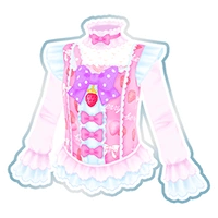 A baby pink top with a pattern of pale pink and red strawberries, white ribbons and berry written in pearl pink. The top is lined in white with frilly trim, a band of white goes down the torso with three pink bows beneath a light purple ribbon with white dot print. A red strawberry with gold leaf hangs from it. The bottom of the torso is lined by pearl pink and white tulle layers to match the sleeves. Dotted lace covers the collarbone, the frilly collar is pearl pink with pink ribbon around the middle, a bow at the center.