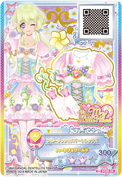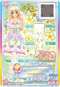 Flourish Sweet Coord (フローリッシュスイートコーデ) is a rare coord by the cute brand My Little Heart. It debuted in Part 5 of the Promotional Collection of the Data Carddass Aikatsu Stars! Wings of Stars series and did not appear in the anime. It shares its design with the Flourish Flower Coord.
