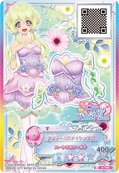 Flower Misty Coord (フラワーミスティコーデ) is a rare coord made by the cute brand My Little Heart. It will debut in Part 5 of the Promotional Collection of the Data Carddass Aikatsu Stars! Wings of Stars series and did not appear in the anime.