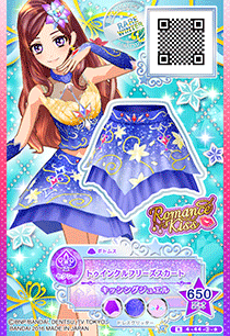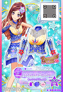 Twinkle Freeze Coord (トゥインクルフリーズコーデ) is a rare coord made by the sexy brand Romance Kiss that debuted in Part 4 of the Data Carddass Aikatsu Stars! series and did not appear in the anime. It’s a color variation of the Brilliant Freeze Coord.