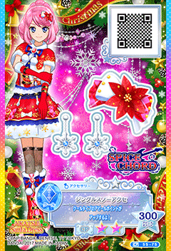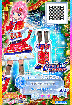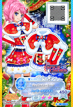 Joyful Bell Coord (ジングルスノーコーデ) is a campaign rare coord made by the cool brand Spice Chord. It debuted in Part 5 of the Data Carddass Aikatsu Stars! Wings of Stars series as a part of Aikatsu! Santa Dress Campaign and did not appear in the anime.