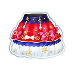 A dark blue tulle skirt with a fluffy white petticoat covered in gold snowflakes and four-point stars. The waistband has a pattern with gold studs, a gold snowflake on each side with a crystal hanging from a pearl chain. Around the skirt is the red patterned fabric with white studded bows sewn around the bottom, alternating with pink check ribbons. Each ribbon is adorned by a ruby gem on gold frame.