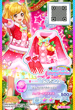 Joyful Bell Coord (ジョイフルベルコーデ) is a campaign rare coord made by the cute brand Rainbow Berry Parfait. It debuted in Part 5 of the Data Carddass Aikatsu Stars! Wings of Stars series as a part of Aikatsu! Santa Dress Campaign and did not appear in the anime.