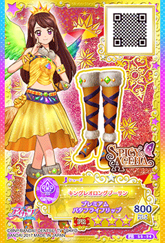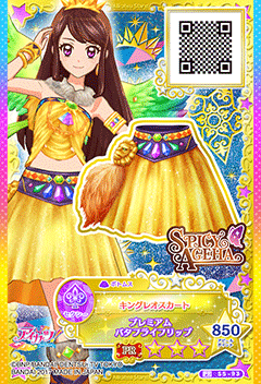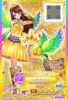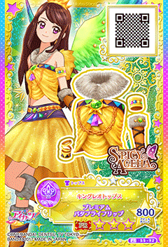 King Leo Coord (キングレオコーデ) is a premium rare coord by the sexy brand Spicy Ageha. It debuted in the original Aikatsu! franchise in Part 1 of the Data Carddass Aikatsu 2014 series.