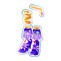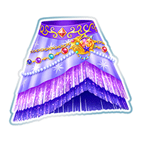 A semi-ruffled iris skirt with a lighter colored eight-point star print. This is followed by two glittery fringed layers of light purple and blue. The waistband is purple with a gold curled vine-like pattern, a ruby diamond at the center. Around the skirt are three chains, the top is gold, followed by one made from assorted gems and gold beads, and one made of blue pearls. They connect to an ornament matching the one on the chest, with a looped chain beneath it made from gold diamonds, dots and three pale blue diamonds.