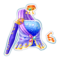 A glittery blue gradient top with a trim of blue pearl frills around the top. Around the chest are diamond shards and flecks. Ruffled iris fabric wraps around the torso, the bottom is lined in gold with a gold diamond pattern above it. This fabric is held by gems of cerulean, amethyst and ruby, each on gold frame. Smaller gems and flecks surround it. Glittery light purple fabric is sewn around the top and wraps around the right shoulder, on the corner is a gold crescent and sun ornament with gem accents, two gold stars and one sapphire star. On the right arm is a blue sleeve with gold cuff and vine-like pattern, the other arm gains three gold bracelets. The gold choker has three dangles and gems adorning it.