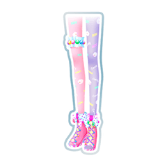 Peach peek-toe shoes with dark lavender shoelaces. The cuff matches the collar with a colorful wrapped candy at the middle. The tights are covered in various colored candies and fluffy white sheep, one leg is soft pink and the other is lavender. On the right leg is a ruffled garter with a rainbow bead chain.