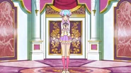 A white and lavender button up top underneath a yellow vest and white blazer with golden trim. The blazer also has lavender cuffs with golden trim and lace and pockets with pink trim. The skirt is also lavender with a golden stripe toward the bottom and white lace underneath. The skirt also has 2 golden buckles on it. The top has a pink ribbon on it held in place with a golden flower. The uniform also has bright pink socks with golden stripes and the footwear consists of white shoes with pink ribbons held with yellow flowers.