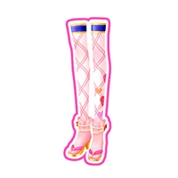 Gold sandals with dark pink toe strap. These are worn with ruffled pale peach fabric with two pearl chains connected by a red bow. White stockings with pink lined pattern are included, print on the lower-leg are assorted hearts. The dark blue cuff has gold lining.