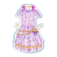 A short white off-shoulder dress with a light purple paisley print. The chest-neckline area is ruffled with sapphire, crystal and amethyst gems around the top, on each shoulder is tied purple ribbon. The skirt is in two layers, the second of which has a gold tulle pattern. Two gold beaded chains wrap around the waist, connected to an ornament decorated with rubies, pearls and an emerald. From this hang two cerulean gems, and the gems from the chest decorate the bottom chain. A matching necklace is included, along with gold bracelets, one with crystal gems, and a pearl bracelet.