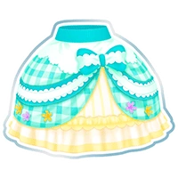 A short pannier skirt made from the top's fabric, with ruffled yellow band around the hem. Layered over this is a gingham peplum with a split, flowers are sewn around the bottom. Around the middle of the skirt is azure ribbon with white frills layered over it. The waistband is azure, with white scalloped fabric layered over the peplum.