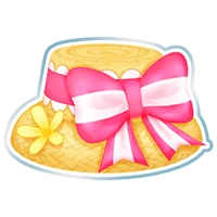 A small straw hat with hot pink ribbon tied around it. White frills and stripes adorn the ribbon, on the corner is a yellow flower.