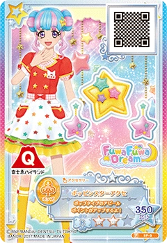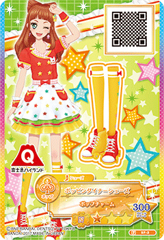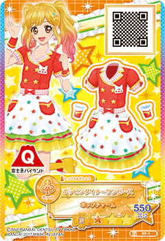 Poppin’ Diner Coord (ポッピンダイナーコーデ) is a normal brandless pop coord. It debuted in Part 5 of the Promotional Collection of the Data Carddass Aikatsu Stars! Wings of Stars series as the Fuji-Q Highland collaboration and did not appear in the anime.