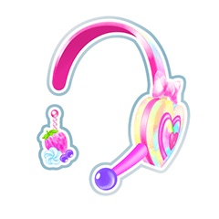 A pink headband with pastel rainbow stripe, connected to a colorful pastel heart on the left ear. This has hot pink heart designs, above it is a pink-white check bow. The fuchsia stick at the bottom has a spherical purple mouth piece. The user gains one pink earring with a strawberry, blueberries and cream.