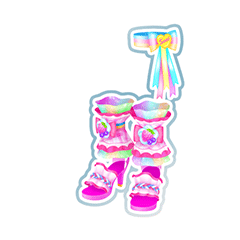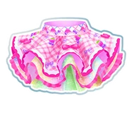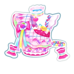 A magenta dotted tank-top with white frills with accenting bottom band. On the corner is a pastel primary color bow with yellow heart, Sweet is written on it. Around the left shoulder is woven magenta, white and light blue strip with white scalloped sleeve. Covering most of the torso is white and pink check fabric with a print of strawberries and blueberries. Two separate layers of fabric wrap around the chest and right shoulder, the secondary layer is pastel rainbow with magenta lining. The white layer on top has a light blue and pink check pattern with pale pink tulle and fruits print along the bottom. On the corner is a hot pink bow with white center, strawberry and two blueberry. Ribbon of pastel blue, yellow, turquoise, purple and red hangs from the bottom. The user gains a choker matching the sleeve with a magenta heart, a primary color bead bracelet, and hot pink and white wrist-cuffs. The nails are painted.
