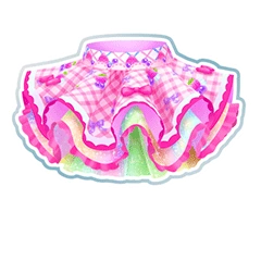 A two-layer pleat resembling a tutu, made from the fabrics circling the right shoulder. Each is lined with magenta frills, accenting the magenta bows sewn to every other pleat of the first layer. The third layer is a pastel pleat that sticks down.
