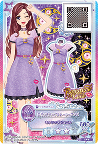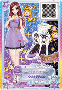 Romance Purple Coord (ロマンスパープルコーデ) is a rare coord made by the sexy brand Romance Kiss. It debuted in Part 2 of the Promotional Collection of the Data Carddass Aikatsu Stars! Wings of Stars series and in Episode 64 of the anime.