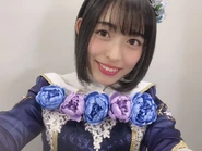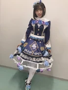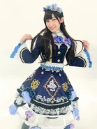 A dark blue low-cut top. The sleeve is tapered with a gold stripe and white bow at the middle, and on the arm is a matching colored diamond with roses. Tulle layers of pale blue and navy stick out from the bottom of the sleeve and torso, and covering the chest is pale blue tulle with lilac and periwinkle roses. The torso has gold and silver lining and a design around the bottom, and a band of blue goes gown the middle with white rose mesh and two silver fleur de lis over it. White frilly fabric covers the collarbone and shoulders, with a pale blue scalloped collar. Around this is a crystal gem choker with a gold piece attached to an amethyst diamond hanging from it.