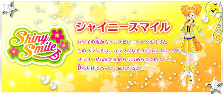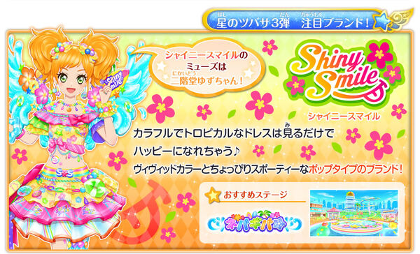 Shiny Smile (シャイニースマイル) is a pop brand that debuted in the Data Carddass Aikatsu Stars! Part 1 and debuted in Season 1 of the anime. The current brand muse is Yuzu Nikaidō.