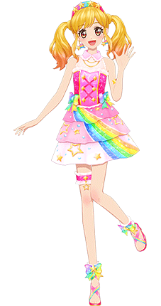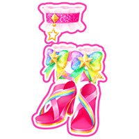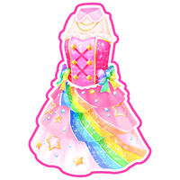 A dress consisting of a glittery hot pink top. The chest has white ruffles and sheer fabric covering the collarbone, the collar is pale pink with frilly lining to accent that around the navel. A band of glittery pink goes down the middle of the chest with hot pink straps held by gold diamonds. On each side of the hip is a glittery colorful striped ribbon. The skirt is in three layers, each lighter than the one above it and covered in pearls and gold stars, some of which are solid. A glittery blue, sky blue, yellow and orange rainbow band stretches across the layers. The user gains a layered gold necklace and star tattoo on the left arm. The nails are painted rainbow.