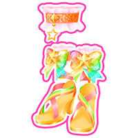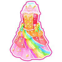 A dress consisting of a glittery red top. The chest has white ruffles and sheer pink fabric covering the collarbone, the collar is white with gold frills. White frills line the arm holes, and pale peach frills circle the navel. A band of glittery orange goes down the middle of the chest with gold star pattern and straps held by gold diamonds. On each side of the hip is a glittery colorful striped ribbon. The skirt is in three layers, the top is orange, followed by light red and soft pink. They are covered in pearls and gold stars, some of which are solid. A glittery rainbow striped band stretches across the layers. The user gains a layered gold necklace and star tattoo on the arm. The nails are painted rainbow.