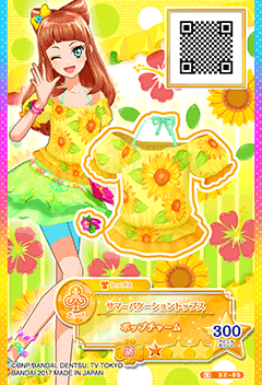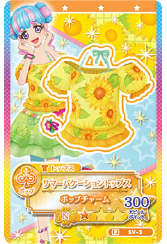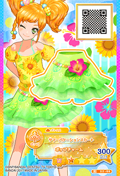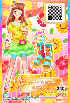 Summer Vacation Coord (サマーバケーションコーデ) is a pop brandless normal coord. It debuted in Part 2 of the Data Carddass Aikatsu Stars! Wings of Stars series and did not appear in the anime.