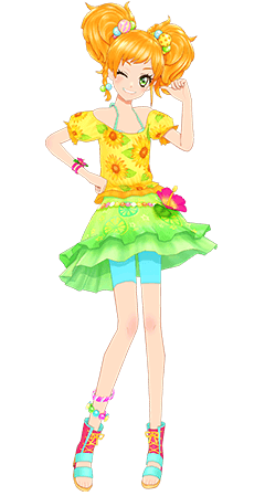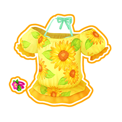 A yellow off-shoulder with sunflower and leaf pattern. The ruffled sleeve trim and bottom is gold colored. Beneath the top is a melon tank-top with ribbon tied behind the neck. The user gains a pair of red bracelets connected by a red flower.