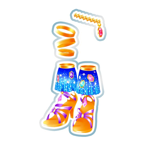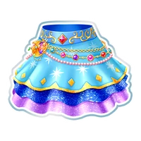A ruffled three-layer miniskirt, the top is aqua with white eight-point star pattern. Around the bottom is gold lining with a diamond pattern. This is followed by two glittery layers of sapphire and light purple. The waistband has a gold pattern surrounding a ruby diamond. Around the skirt are three chains, the top is gold, followed by one made from assorted gems and silver beads, and one of pearl. They connect to an ornament matching the one on the chest, with a looped chain beneath it made from gold diamonds, dots and three pale blue diamonds.