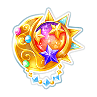 A split top, the main portion is aqua with glittery fringe around the bottom and three large gems, coming in pink, light purple and sapphire. Tiny diamond flecks surround this. The top of the chest and shoulder is lined in gold, and on the corner is a gold crescent and sun ornament with gem accents. The chest area is glittery light purple with gold frills and diamond flecks, while the lower-half is sapphire with white eight-point star print. On the left arm is an aqua sleeve with gold cuff and vine-like pattern, the other arm gains three gold bracelets. The gold choker is adorned by gems, with one hanging from the middle.