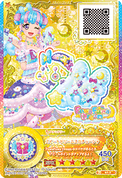 Sweet Dreams Coord (スイートドリームスコーデ) is a star premium rare coord by the pop brand FuwaFuwa Dream. It debuted in Part 1 of the Data Carddass Aikatsu Stars! Wings of Stars series and in Episode 54 of the anime. It shares its design with the Sweet Limelight Coord.