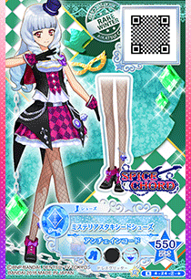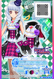Mysterious Tuxedo Coord (ミステリアスタキシードコーデ) is a rare coord made by the cool brand Spice Chord that debuted in Part 4 of the Data Carddass Aikatsu Stars! series and did not appear in the anime. It’s a color variation of the Phantom Tuxedo Coord.